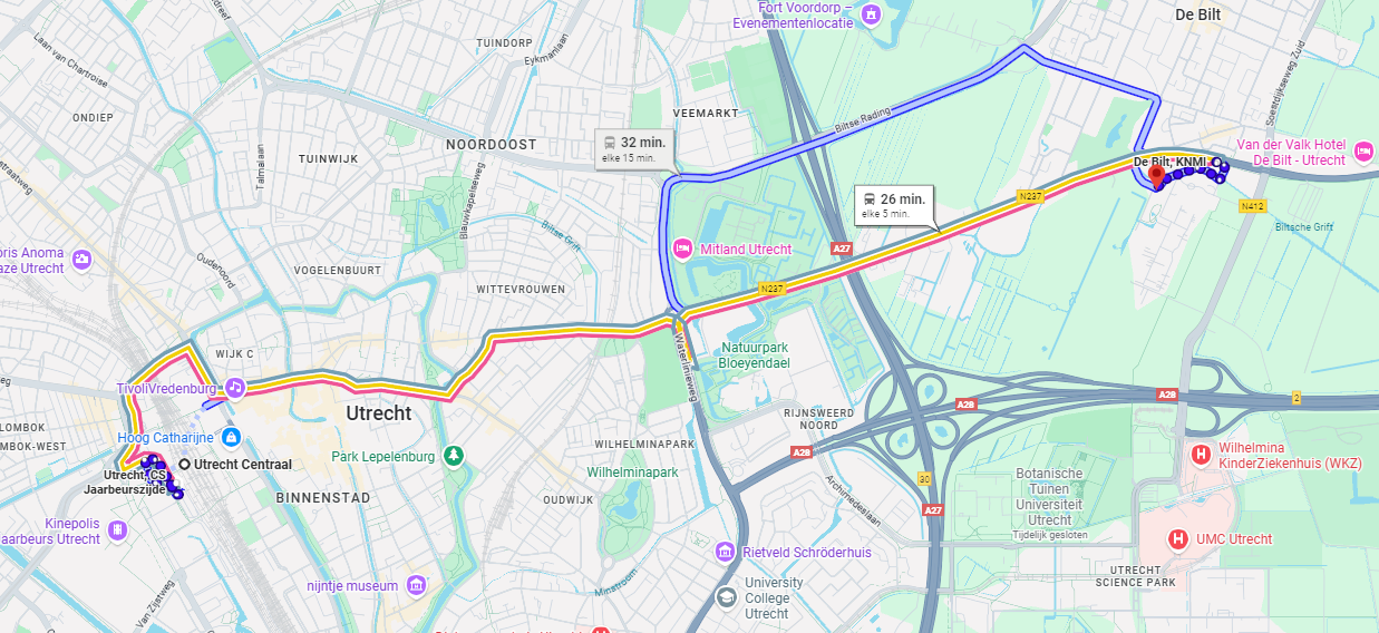 • From Utrecht Central, take a bus to KNMI (e.g. bus line 350, 73 or 74), or use a taxi or rental bike (OV-bikes require a OV-chipcard with subscription).